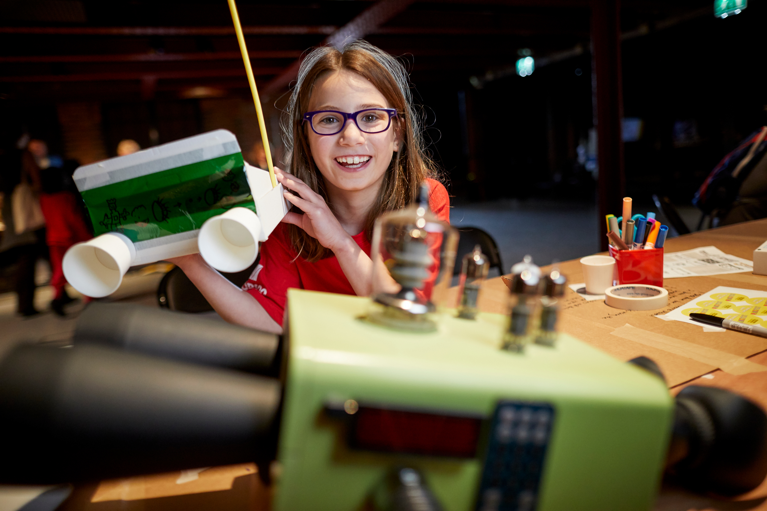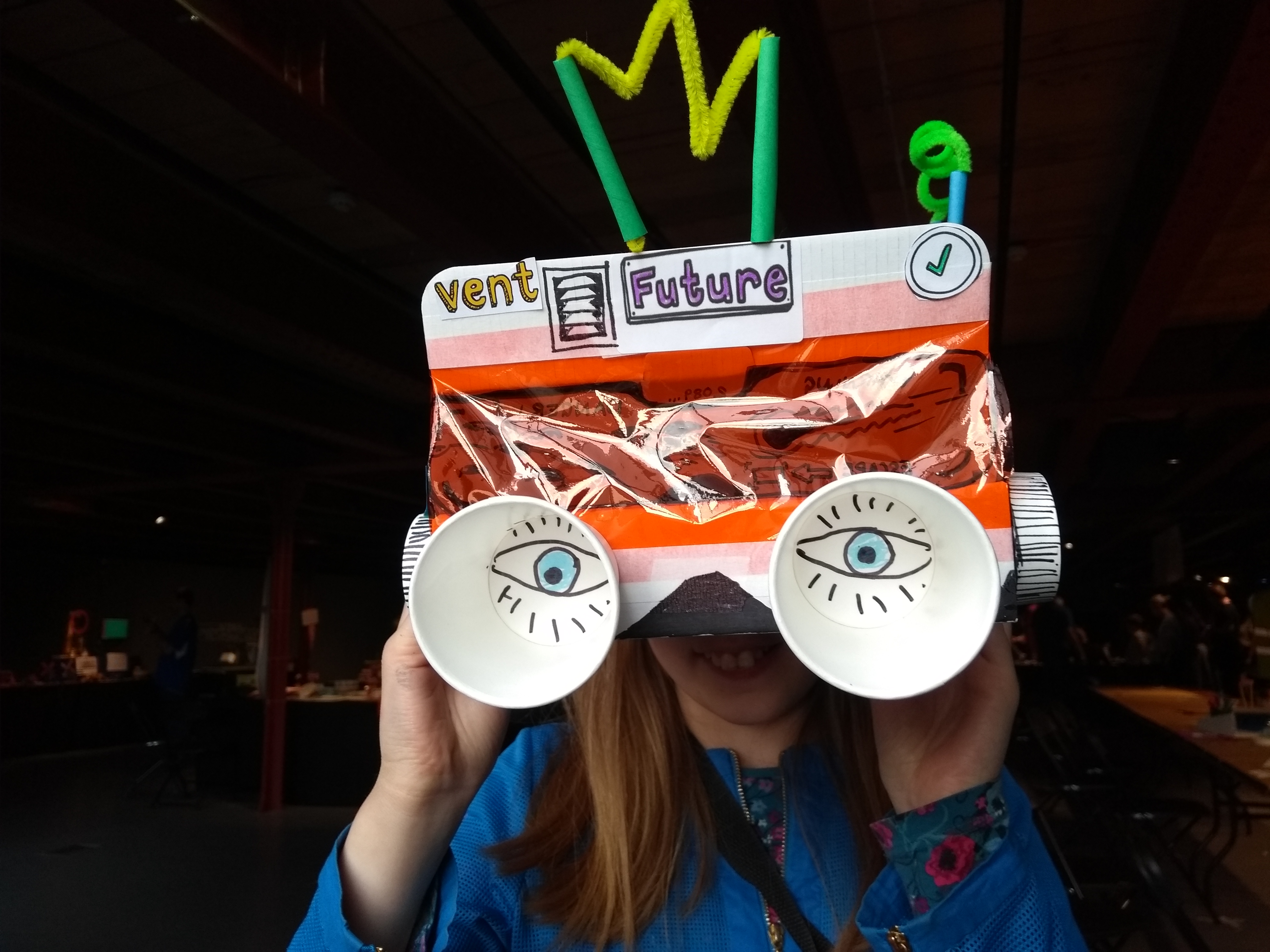 Over 4000 visitors came to MakeFest over the weekend and hundreds of families (and a few big kids!) imagined what they would see through binoculars that can show you the future. We had underwater houses, alien invasions, polluted landscapes, fantastic flying machines and one inventor showed the view out of their spaceship looking back at earth. The workshop was inspired by Dominic Wilcox’s Future and Past Viewing Binoculars which were on display for everyone to get ideas for their own machines. Inventors had to think about what their buttons did and what date they could see, there were danger dials, radars and antennas. One came with a colour picker allowing a choice of rose tinted or green futures.