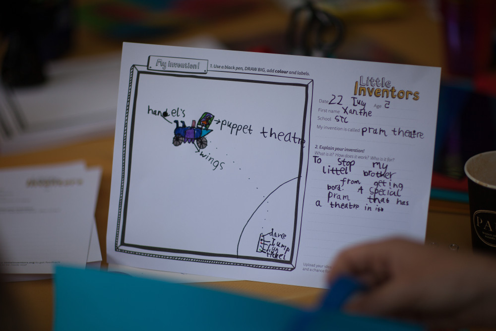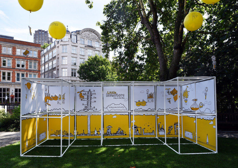 We took over the West Smithfield Rotunda Gardens on Saturday 22 July 2017 as part of the archikids weekend. We invited children to create a vision of what a city of the future could look like, first by drawing their clever, funny, unexpected and ingenious ideas and then creating models which were then added to our flying cityscape. As ever, there was no limits to our Little Inventors imagination, and we were truly delighted to welcome to our invention family such wonders as the choccy biccy locator, broccoli tunnel shoot and moustache puff, amongst many others.