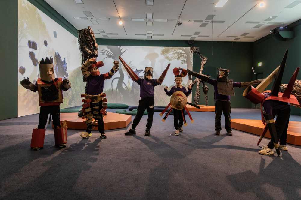 Based on Baltic exhibition Mythmachine by Sahej Rahal, during the STEAM-centric workshops the children were challenged to use their imagination to create their own mythical creature. They then created a set of wearable components to perform as their creature. The exciting, school-day length experience incorporated story-making, drawing, making, texturing, sound creation and performance.