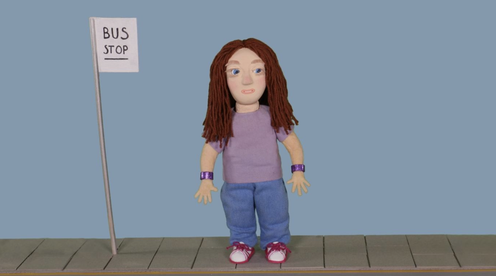 When I met with Bo we talked about where to set the scene of the animation. We decided a bus stop would be good as people get quite cold when waiting for their bus to arrive. I’ve made a little road and bus stop sign to put the character on. The background is green so that I can change it later on the computer.