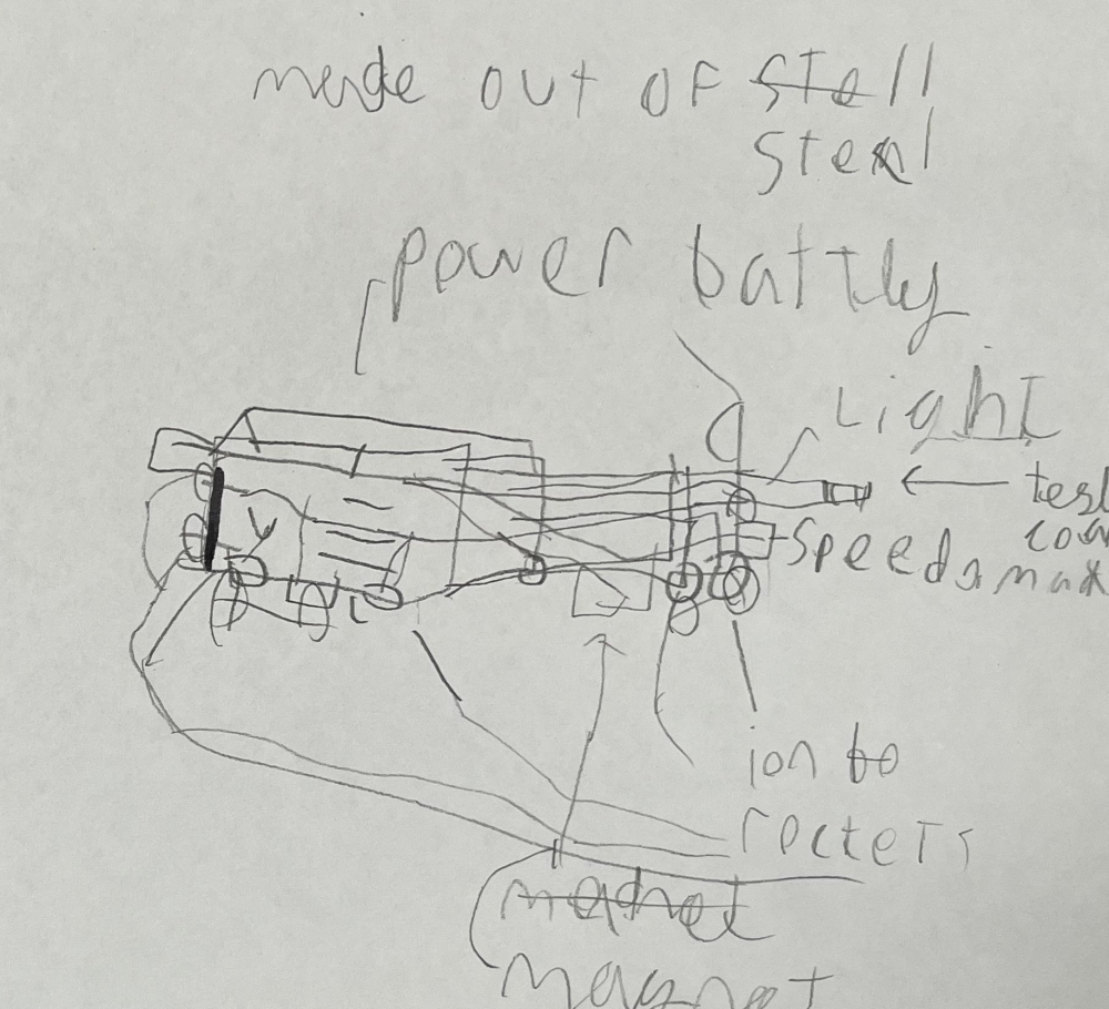 Your invention sounds absolutely amazing! A 3000-megawatt battery - that’s incredibly powerful! It's brilliant how you've combined magnets to keep it grounded and rockets to help it move and fly, Aveor. That’s a really smart way to control its movement. Your idea shows great imagination and problem solving skills, and I can tell you’ve put a lot of thought into how it works. Keep up the amazing work!