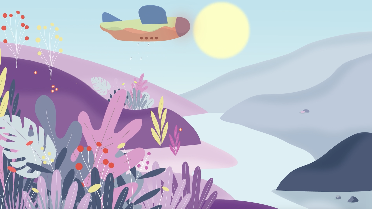 Here there are the sketches for the main scenes of the video. I like the idea of a story where the Aviòn wakes up because it has detected somewhere in the world a sad flower in a dryland and starts its routine by flying over and re-greeinig the lands that laks plants and water. I want to make sure to make visible in the video how the Aviòn stores enery during nigh-time, bad weather because I thought it was so clever!!