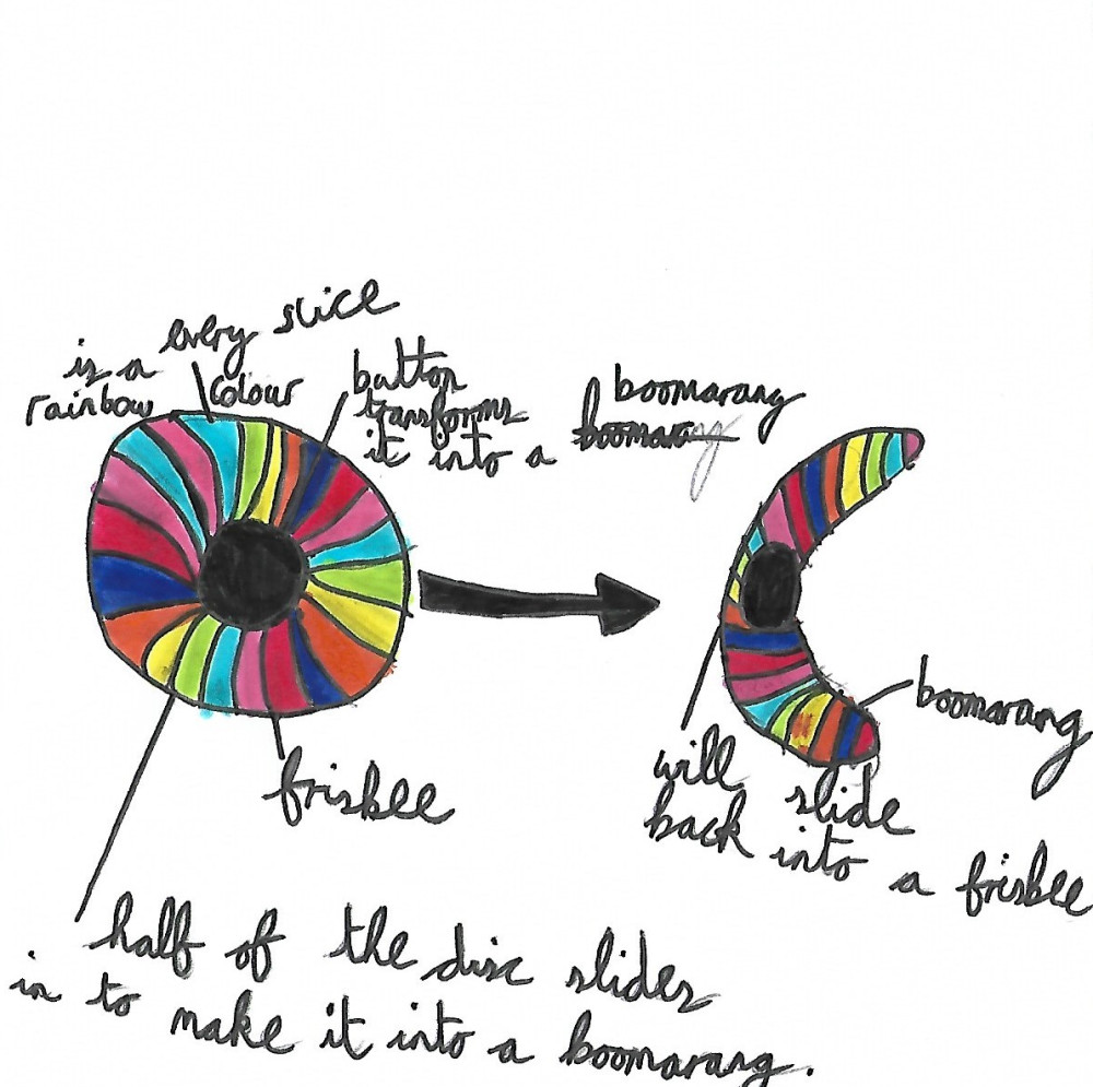 We’re trying to make an invention into a real prototype, the invention we’re going with is a Boomabee, essentially a frisbee that converts to a boomerang in a very rainbow stylee. How functional does it need to be? This isn’t about making it look like the drawing, it’s about taking it a step further into something shiny and crafted. Given the invention we have chosen, I suspect they won’t be throwing it around in the gallery but it looking good, convincing and crafted is a must.