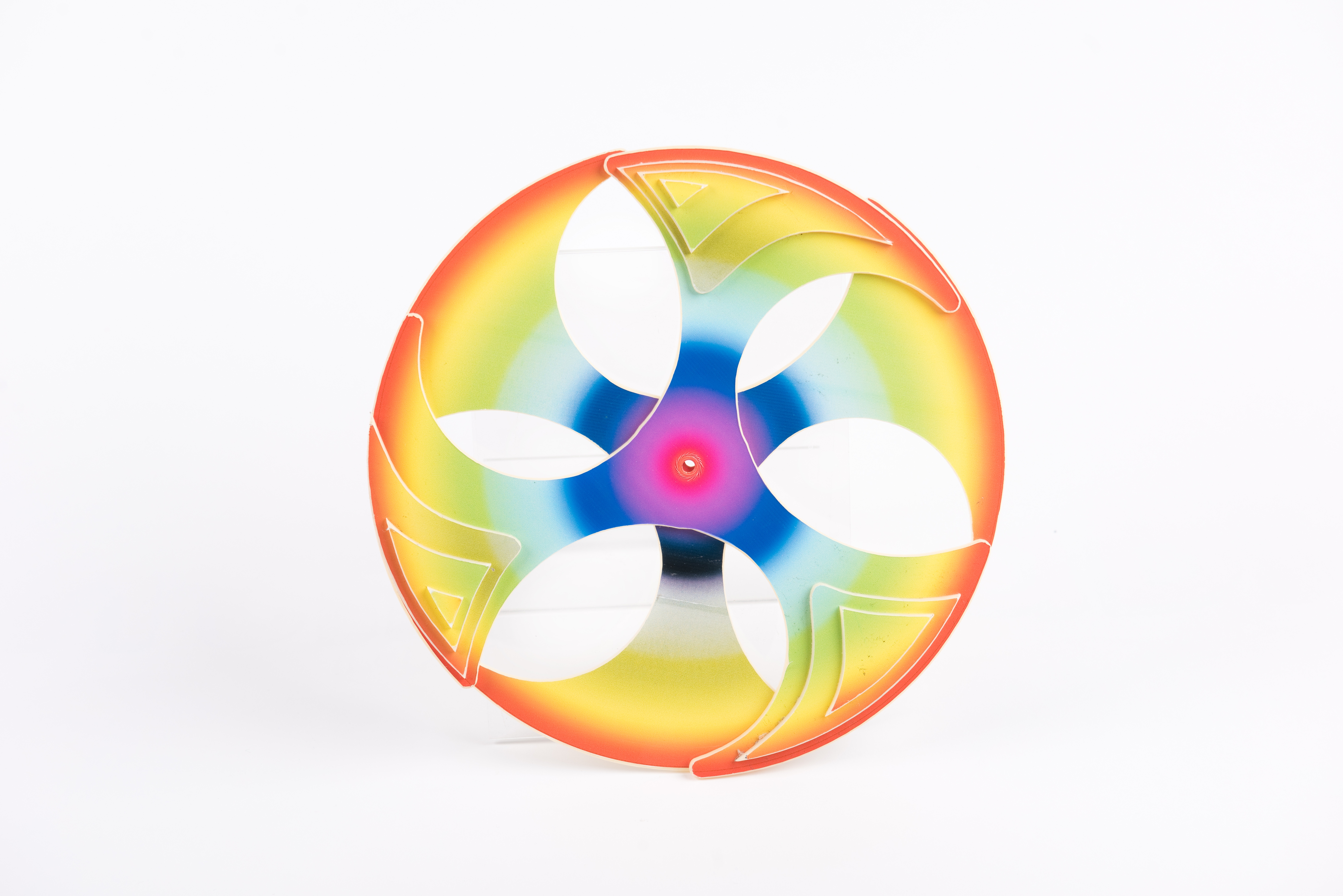 The next thing that happened was that ben had a good excuse to sit down at the 3dprinter and print lots and lots of mini boomarangs. These made great toys and are good fun to play with. What he was trying to do was create the 3d version of Toni’s design, first making a 3 pronged boomerang, and then making a version that was hollow which could fit some fabric, but these were super small. We then hooked up with Stuart, with his huge amount of design and making experience. He pointed out that we didn’t need the fabric sketched out a design on the back of an envelope (literary). The next day we started to make the digital files, laser cut two copies of the design and also printed the rainbow. By this point it was really coming together. Looking like the Boomabee, Finishing Up: