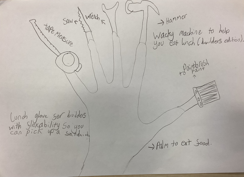This is a really great idea Neve that would keep builder's hands protected and warm in-between jobs. Such a handy (see what I did there) invention, everything a builder could need is right at their fingertips! And the best part is, they don't have to wash their hands before they tuck in to lunch! Your drawing is detailed and well labelled too. thank you for sharing it with us. Keep designing unique and useful inventions Neve, we can't wait to see what you design next!