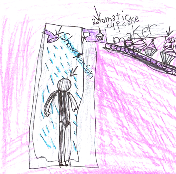Once we chose Olive's amazing idea, we started to sketch out our design idea. We wanted to make the shower as 'showery' as possible. Curtain, tiles, shower head, chain and all.
