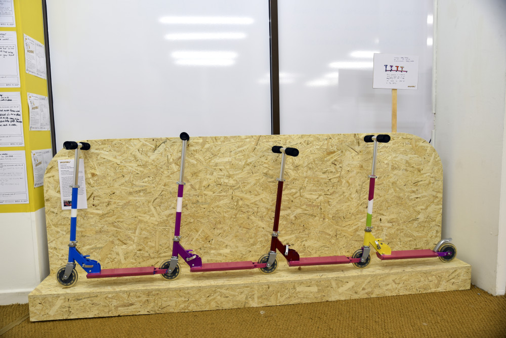 Wendy’s invention sketch was clear and conveyed much of what we needed. We met with Wendy at AMAP to get Wendy involved in assembling the final version of the scooter. This design really works and has seen lots of people keen to try it out and have fun. It was important with 5 wheels in a line that we ensured the scooter would articulate and steer so we had to make ensure the finished product was safe and manoeuvrable, which we discussed with Wendy.