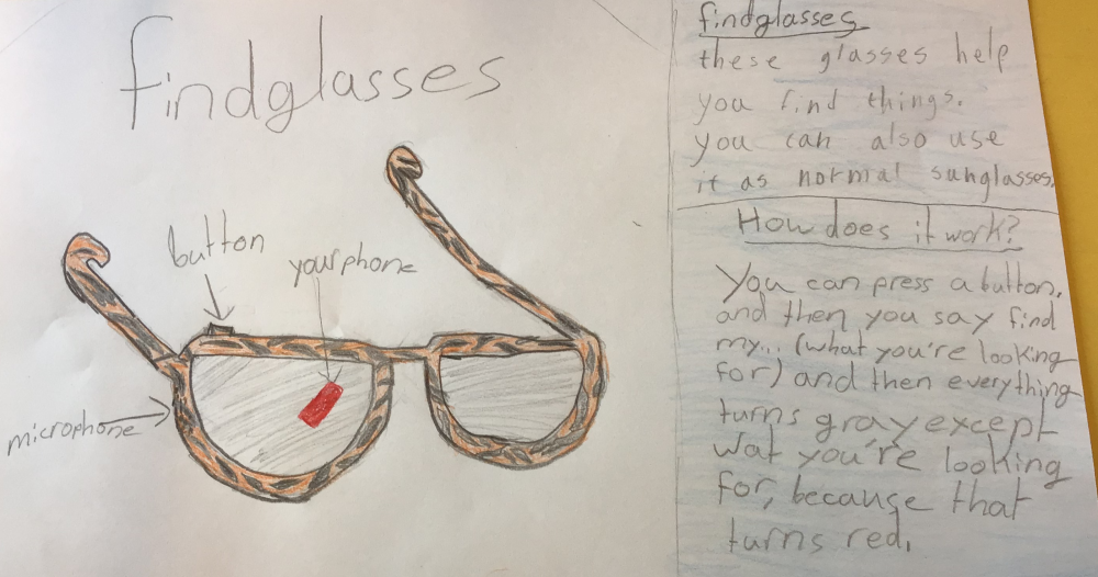 The sunglasses you have invented here is a fantastic idea Lisa and Minouk! Not only are they sunglasses but they also help you find anything that you have lost, which makes it a very clever idea. You talk into the microphone what you have lost, and then the FindGlasses will locate them using its very special colour changing feature. Looking forward to seeing other inventions you come up with!