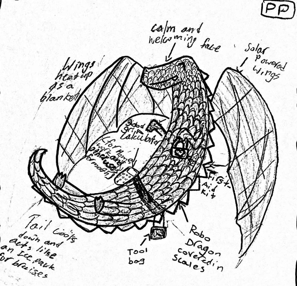 I am floored by your drawing Delilah, wow, wow, WOW! First Aid Dragon is an impressive feat of invention. It's already wonderful when someone comes to your aid when you are sick or need medical attention but a dragon coming to help you would be especially awesome! You have equipped it with all of the vital stuff needed to attend to a sick person. Using solar energy is such a great way to power a dragon that would be gliding all around through the sky too! Keep up the great work!