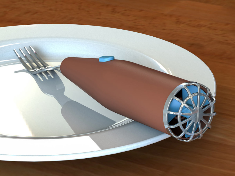 “The concept was for a fork that could be used when you food was hot. When you press the button cool air would be drawn through handle and out over the hot food to make it more suitable to eat. Although the fan is intended to be made from rubber to prevent injury, a safety cage covers the fan. The colours are as specified by the client.” Andy Mattocks
