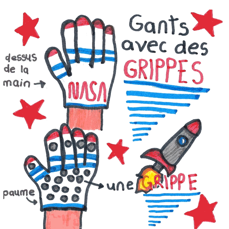 On a d’abord été tentés d’adapter le design de Tiffany pour remplacer le logo de la NASA par celui de l’Agence spatiale canadienne. Après tout, la NASA (National Aeronautics and Space Administration) est états-unienne et David Saint-Jacques est un astronaute canadien. Un détail nous a cependant porté à remettre en question cette décision : le logo rouge utilisé par Tiffany représente un logo utilisé par la NASA surtout dans les années 1970 et 1980 affectueusement surnommé « the Worm ». On cessa cependant de l’utiliser en 1992 et la version « Meatball » qu’on voit aujourd’hui fut restituée. Compte tenu que l’Agence spatiale canadienne (ASC) n’a vu le jour qu’en 1989 (et son logo en 1996), « the Worm » et le logo de l’ASC ne se sont finalement jamais côtoyés. Comme on aime beaucoup le look rétro du logo rouge sur les gants, on a choisi de le conserver et de rester fidèles au design original.