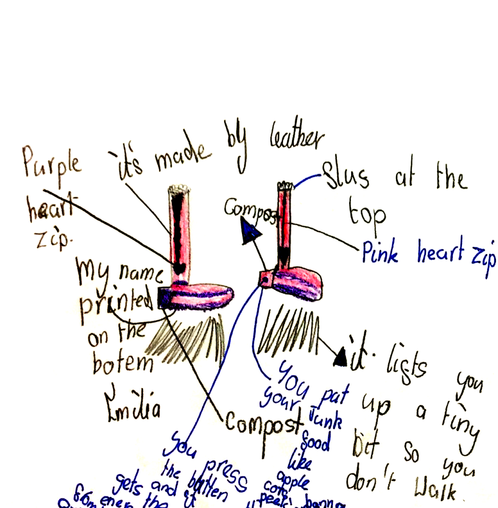 What an amazing pair of boots Emilia! I'm sorry to hear that you hurt your leg last week, you're right, the hovering boots would combat any injuries and be so much fun too! They sound like they would look great and they certainly do in your drawing, it's important to make sure your name is on the boots so no one can claim them for themselves. My favourite part of the invention is that the boots are powered by leftover food waste, what a fantastic idea! This makes the boots a sustainable way to move about. Excellent Emilia, keep it up!