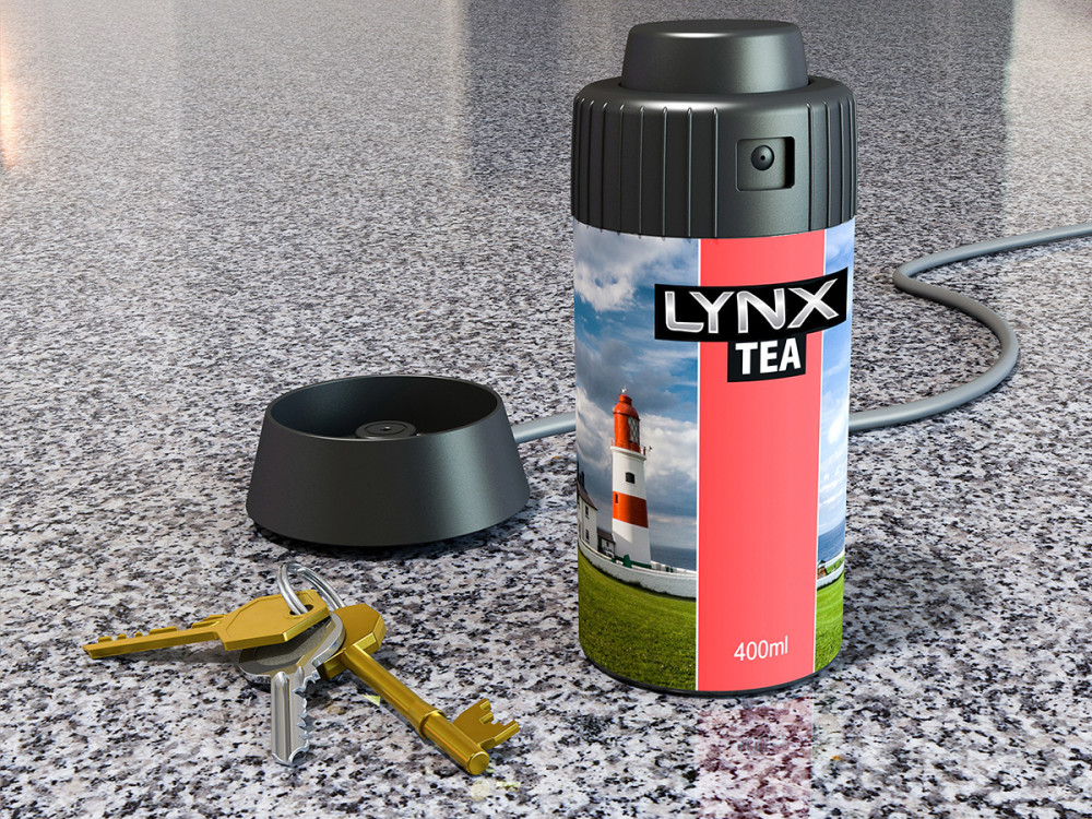 “As described in the client’s briefing, when you have no time, grab your tea and keys and go! Features specified by the client include mains dock or internal batteries to keep the tea hot, twisting top to lock off the spray and cover the nozzle and the materials. Colours proposed largely to colour specification. Fictional branding for illustration purposes only.”