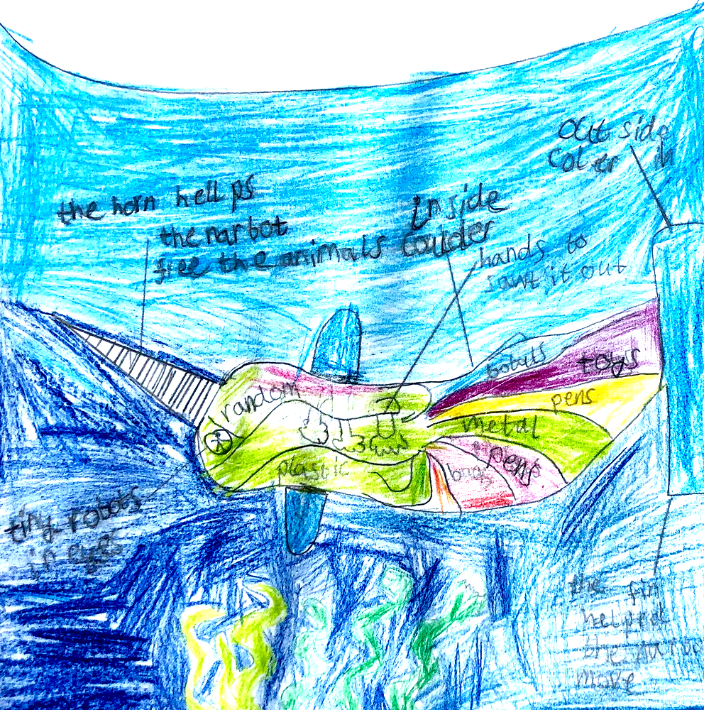 My favourite part of your invention Evie is that it can sense injured animals. This is a super unique feature, and a very important one! The narwhal does look very lifelike in your brilliant picture, all of the inner storage sections would help organise waste properly so it can be removed from the sea. Tiny robots in the narwhal's eye are also very unique, it seems like they would help the invention work correctly. Your invention being made from recycled materials is a wonderful aspect, it makes it sustainable and puts the waste to good use! I look forward to your next invention Evie!