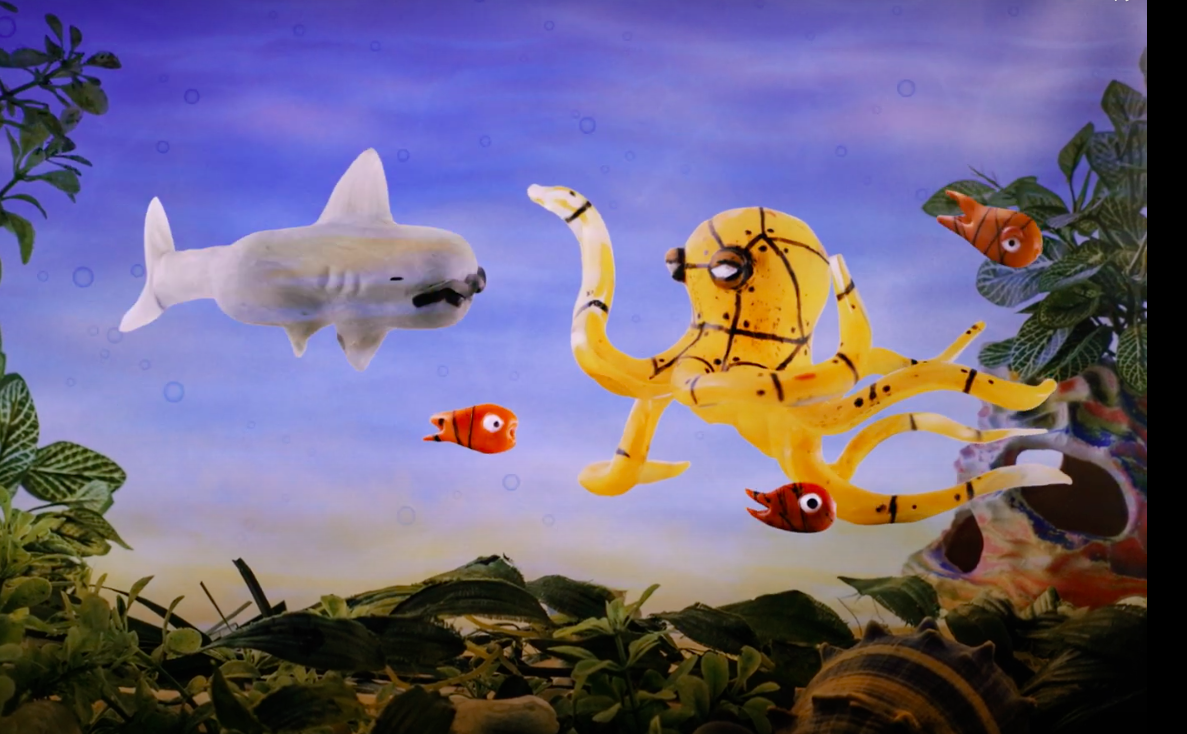 Now I am ready to start animating! Back to the string and tape. First, I created the "underwater" scene with real fish tank items, added some paper bubbles for fun! The tricky part here was balancing the octopus and shark on strings, I felt like a real puppeteer. Once I had all the pictures I needed to animate, I illustrated the water background and then filmed some ink being shot into a water tank to create the octopus ink effect.