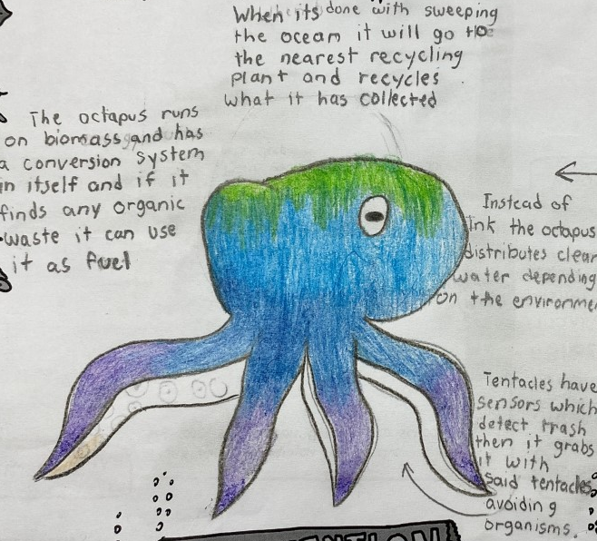 You have drawn such a fantastic octopus Danica! You have put lots of work into your invention and into thinking about how it works and what it does. Using waste as fuel and recycling it too is an eco-friendly way to handle pollution. I also really like that the octopus distributes clean water instead of ink, how clever! This is a super efficient invention Danica, very well done!