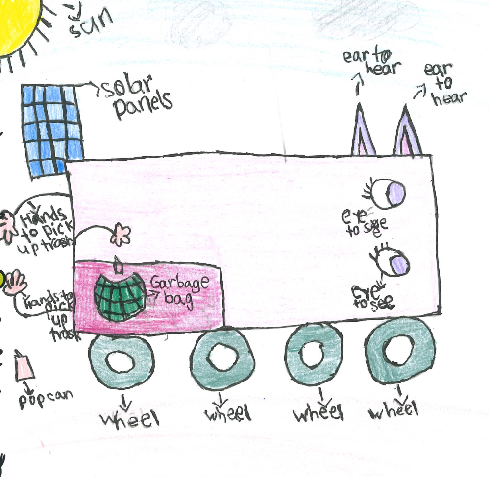 Steve Elliott held a virtual design review meeting with Charlotte, inventor of the Picker Upper Monster. During the meeting they talked through different features Charlotte envisioned, including placement of the trash bin, and placement of the "eyes" of the monster and overall shape of the monster.