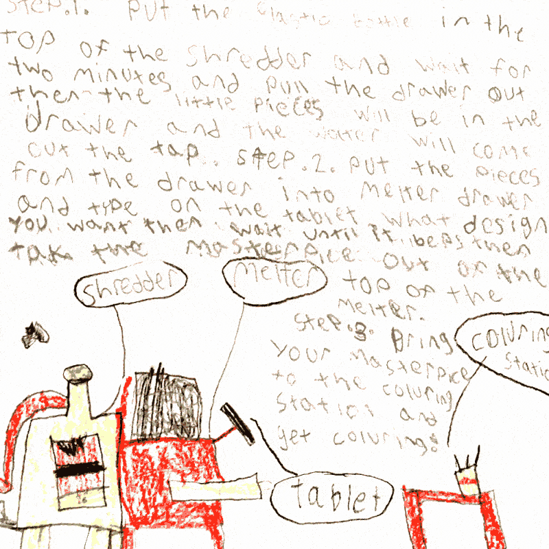 I zoomed with Erica a short time later to discuss her invention and we went over my drawing of her invention ”Plastic Masterpiece Maker”. My drawing shows an industrial plant with a conveyor belt running from one machine to the next. Erica agreed and had a few thoughts about what colours she would like to see, she gave the go ahead and work began to bring her invention to life.