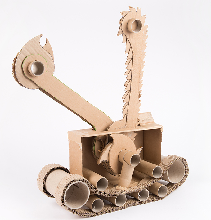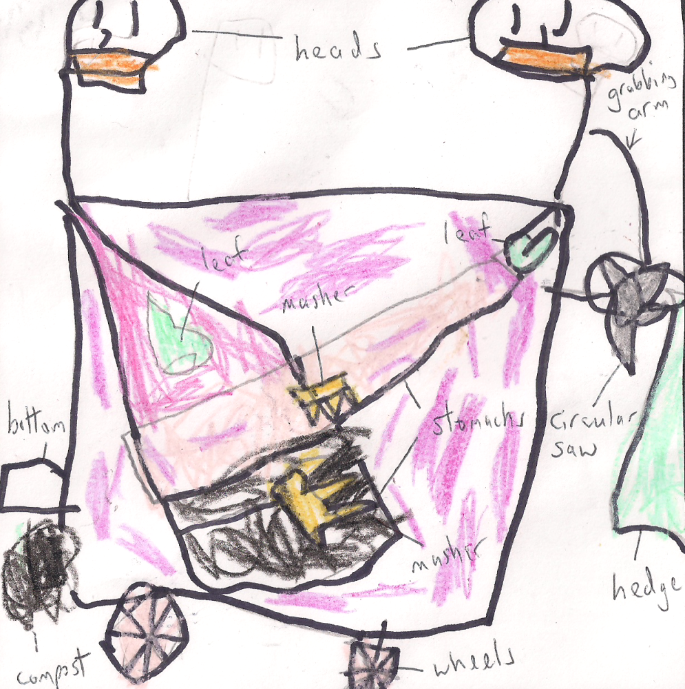 This invention would really help people who can't use heavy hedge trimmers. I've had a go at making it in cardboard. I looked online for pictures and I modelled the shape on a diplodocus and used a chainsaw for the tail and secateurs for the robots mouth. I added to Oliver's design by adding caterpillar tracks so that the hedge cutter doesn't get stuck in mud. I started with a pre-made box and built the grinding stomach by cutting loads of cutting disks and threading them on to a tube. I made the tracks by peeling the top layer of paper of the corrugated card to give it the texture of a caterpillar tread. Oliver's robot has two heads I like how the secateurs look like a mouth and and eye of the robot.