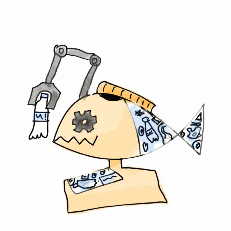To come up with the general style, I put together a collage of different goldfish, robot fish, and First Nations artwork for inspiration. My main goal was to highlight Jayla’s core ideas that I took note of from our interview and make simple adjustments to the other attributes of her invention.