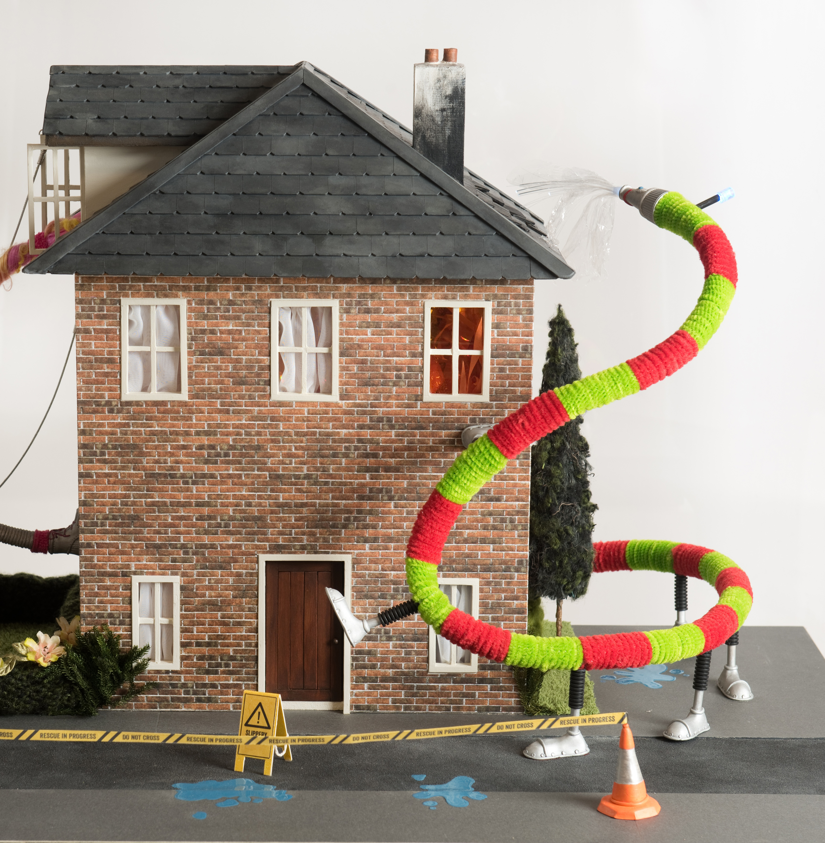 The Robot Water Blaster hose is made from a plastic pipe tube. It has a thick wire through it so that it stays in position. I originally used gaffer tape to cover the tubing as it was a similar texture to real hose pipes, however, it started to peel off the plastic tube so I needed to find a different material. I ended up using pipe cleaners, which give the hose a bit of character and make it fun and child-friendly. The end of the hose is a cake icing nozzle and I used optic fibres and clingfilm to make it look like there is water coming out of the spout. The shoes are made from oven bake-able clay, with wooden dowel legs that have rubber tubing around them. The look of the fire inside the house is achieved by a fan blowing tissue paper and sweet wrappers. I used a self build RGB controller kit to control the flickering of the lights and added coloured lighting gels to make them orange. I added a flashing blue light onto the design as I thought that it may need this when dashing through traffic!!