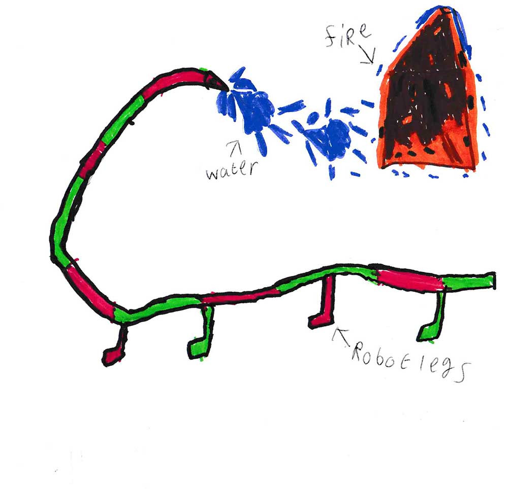 'I thought that the Robot Water Blaster was a very useful idea to help out firefighters in dangerous situations. I wanted to incorporate the bright eye-catching colours Emilia came up with and also put the invention into a scene as she illustrated - to show how it would be used in an emergency situation. I added a flashing blue light as I thought it might be required when the Robot Water Blaster dashes to where it is needed!'
