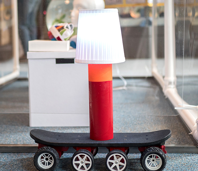 The Rolla Lampa's chassis is a miniature skateboard, and the rest is built from household components: a heavy cardboard tube and a lamp shade. Most of the electrical parts of the Rolla Lampa were salvaged from a remote control car, though I had to adapt much of it to power the lights and increase the energy going to the motors; the new chassis weighs ten times what the remote control car did so it needs a lot of extra juice to get about!