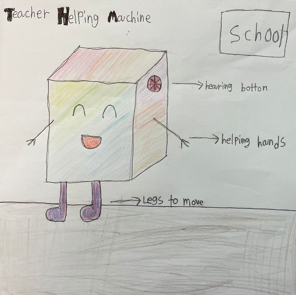I can think of a lot of teachers Daae who would love your Teacher Helping Machine. How clever that it responds to voice recognition, ensuring that it helps the correct person. Well done for designing the robot out of recycled materials and powering it with solar energy to make it sustainable. I wonder if it can be asked to do any task or if it has a list of pre-programmed functions? What will you invent next?