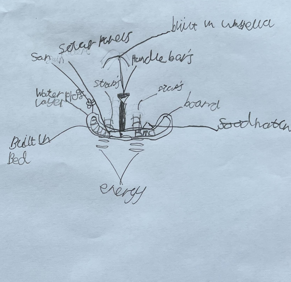 That is such a clever and thoughtful invention, Charlie! You’ve clearly put a lot of care into making it comfortable, safe, and eco-friendly. Including things like a built-in bed and food catch shows you're thinking about how people would live and travel on it, not just how it moves. The solar panels and waterproof layer are smart choices too, they help protect the environment and keep traveler's safe. You’ve combined imagination with problem-solving in such an exciting way. Keep going!