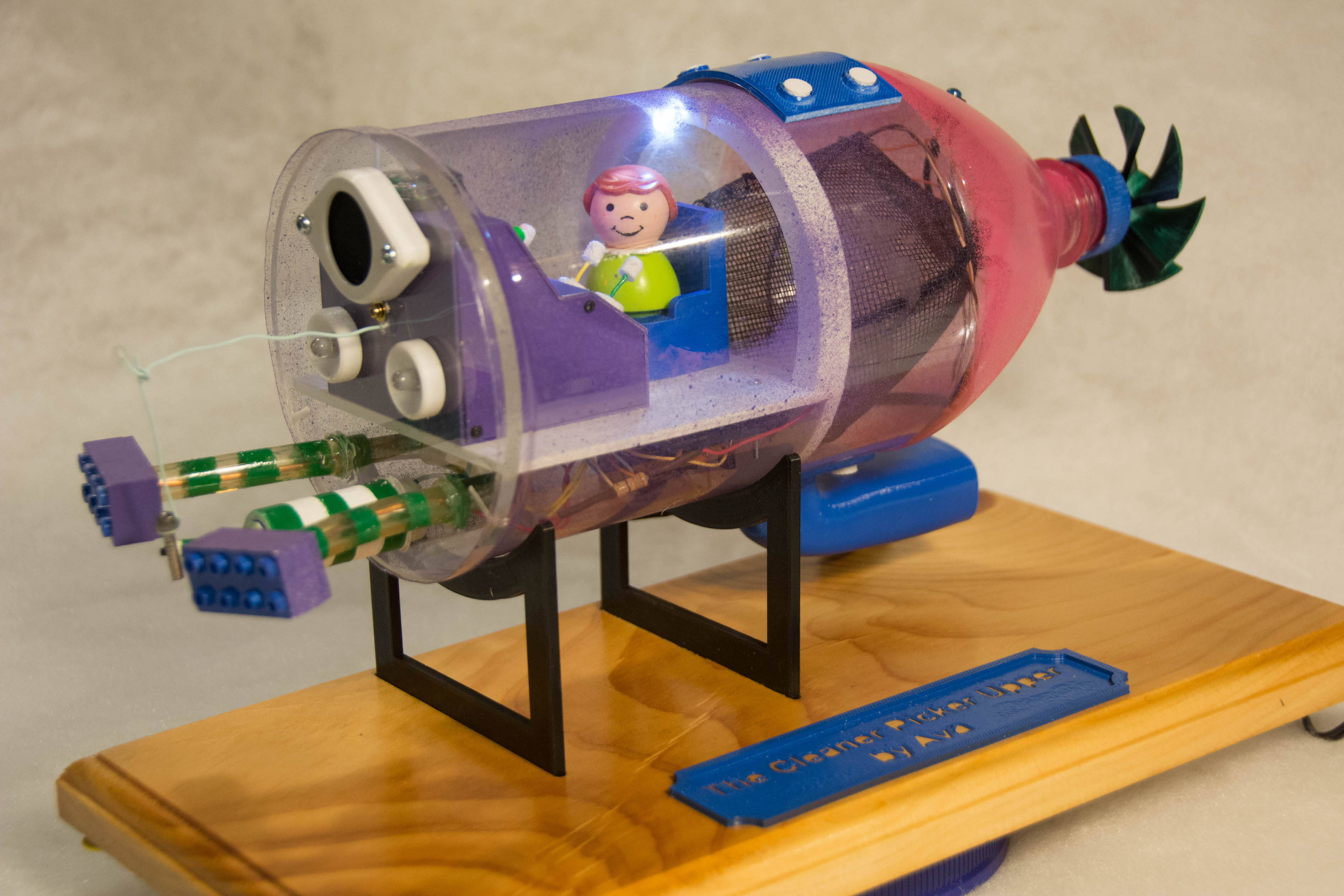 Well, this has been a very interesting project. Ava's idea of a submarine to clean the ocean water of plastic and metal pollution was very clever. I think I was able to bring her inventive idea to life through this little model. Once powered up, the model randomly switches on the propeller to drive the submarine, the beam lights to help guide the vessel through the murky waters, the sonar to detect potential obstacles or avoid schools of fish and finally an electromagnet to pick up metal debris. The waste is collected in a bag while the filtered water is channeled through the exhaust manifold.