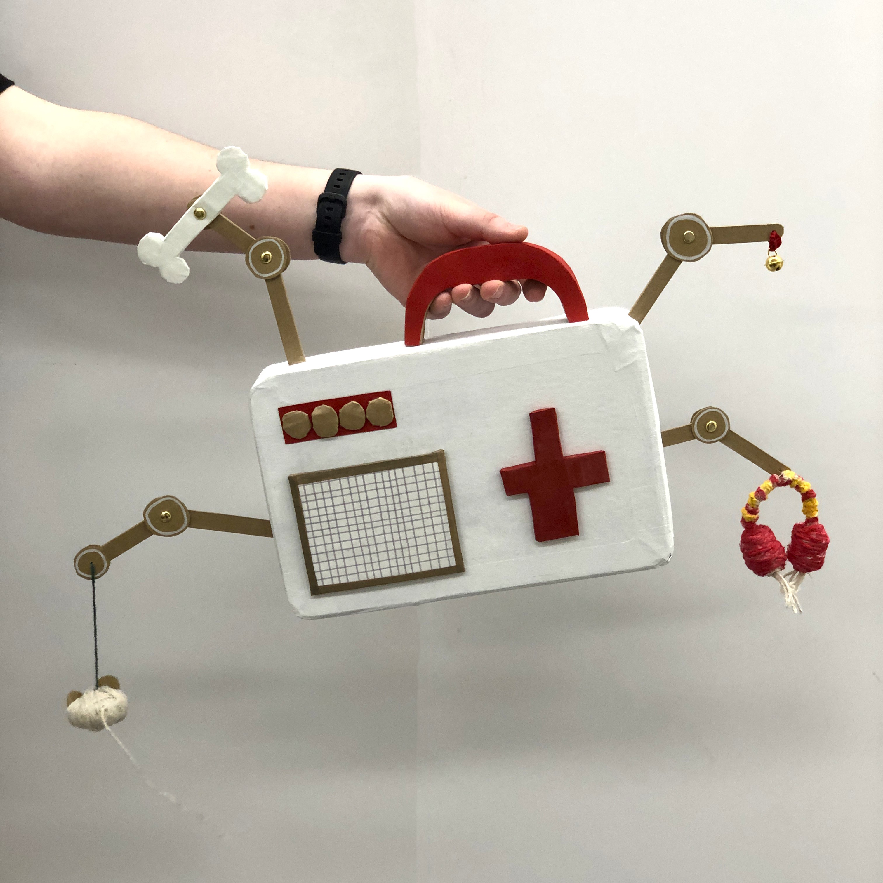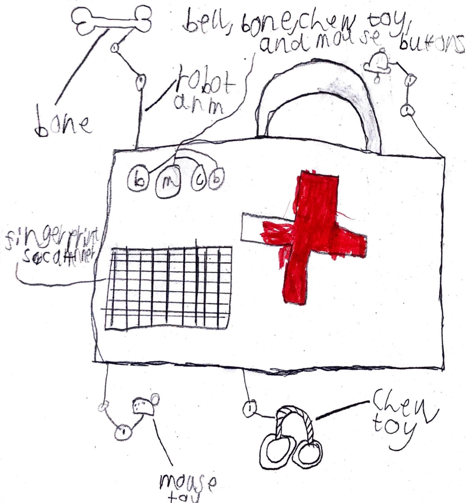 Joe's invention has lots of fun things for cats and dogs to be made happy with. The human who uses it uses the fingerprint scanner to get into the first aid part. It's a win for canines and felines everywhere!