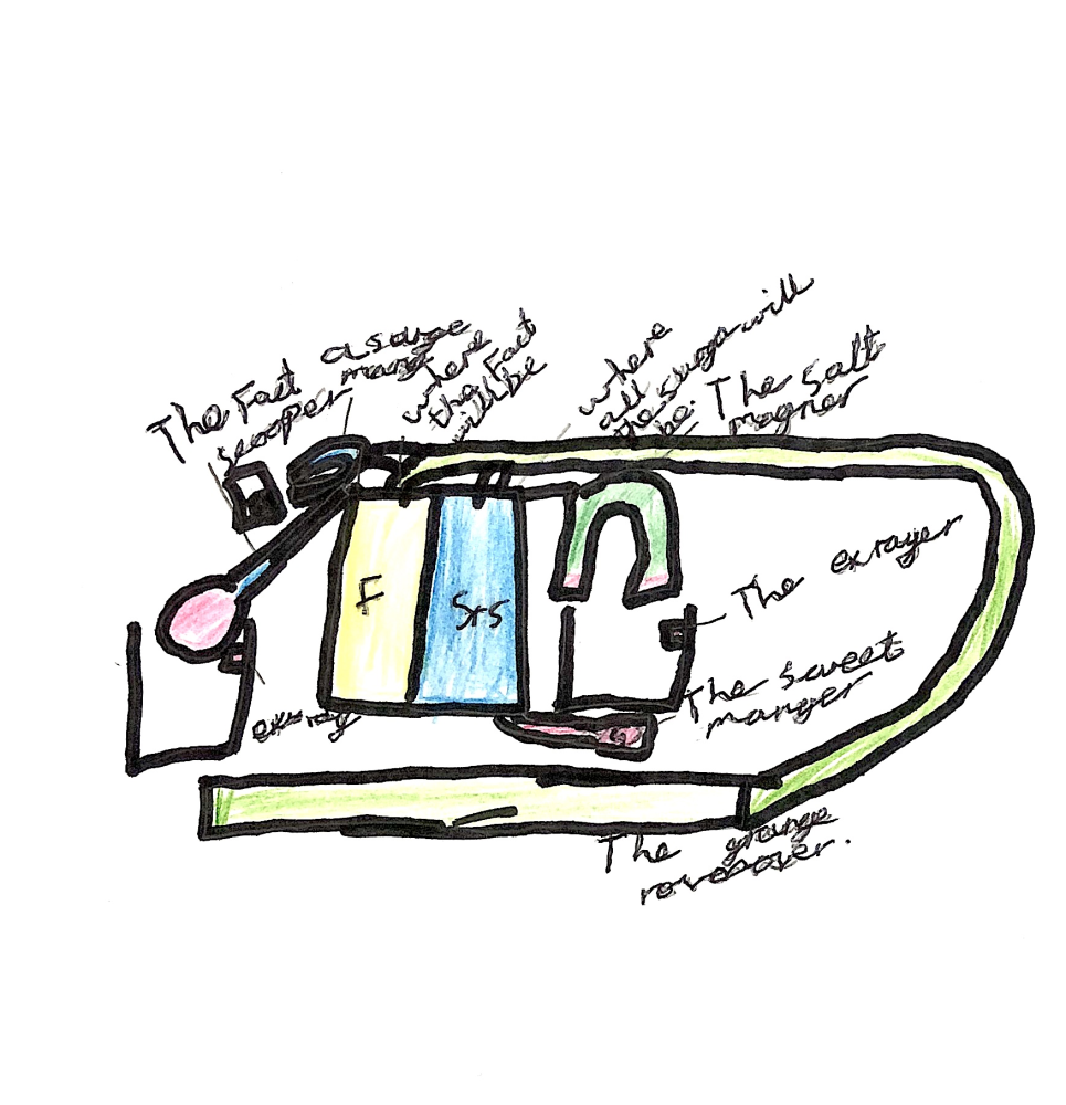 I took Hillary's invention drawing and sketched it in more detail, with more in dept annotations. I kept the parts and colours the same but simply drew the machine how I would illustrate it in illustrator.
