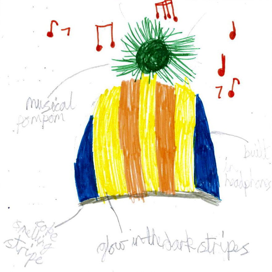 Wow, The Incredible Hat sounds incredibly bonkers, I love it! What a fun idea to have musical pom poms and glow in the dark stripes (which would also be a good safety feature) I'm curious about the coke smelling strip, would that come in different scents of peoples favourite smells? I'd choose rhubarb crumble. You certainly have the knack for fun inventions, well done Hannah.