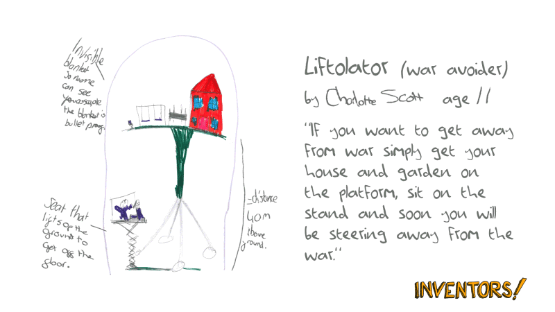 Erin was initially attracted to the Liftolator ‘war avoider’ due to the dark themes viewed from an innocent 11 year old’s perspective, which reminded her of the abstract and controversial works of 1960’s architectural group Archigram. The War Avoider envisages a utopian escape for those living in war torn countries, complete with a starter pack, an invisible shield and a pre-planted vegetable patch. A family can enter the pod via the elevating armchair, and live safely and happily while Liftolator drives itself to a more peaceful location.