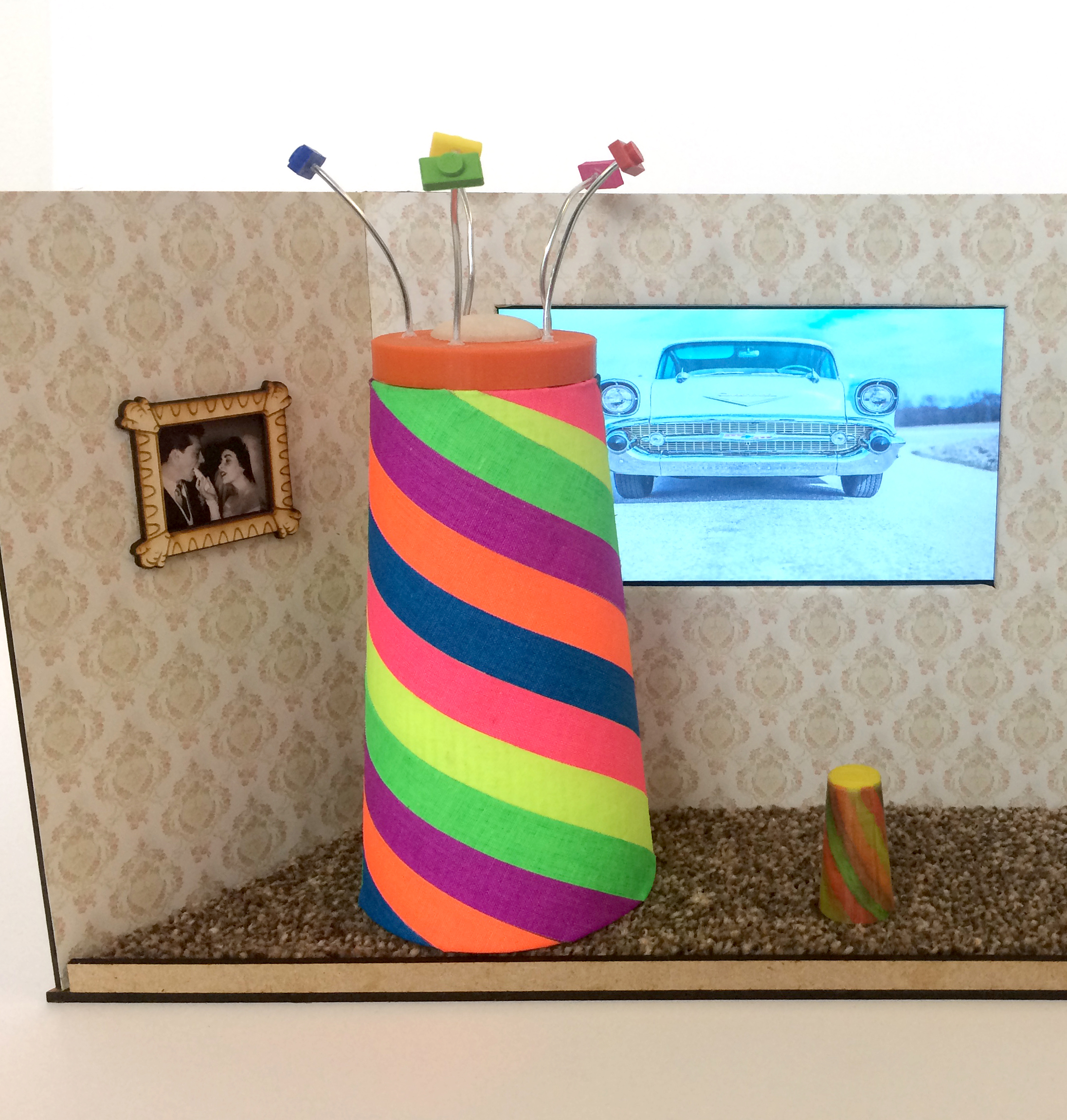 For the Memory-o-Matic we used a mixture of 3D scanning, 3D printing, and craft materials. For the room mockup, we created this using a laser cutter for the frame, craft materials, and a digital photo frame...This is a lovely invention and very helpful idea for people suffering from dementia. Rosa had a very clear vision for her invention and using a variety of fabrication machines we were able to make her dream a reality.