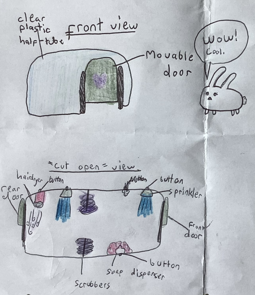 That's such a creative invention idea! I'm really impressed with how you've thought about making pet bath-time easier for everyone. The way you've designed the tube with scrubbers, water sprinklers, soap squirters, and hair dryers shows a lot of thoughtfulness and care for pets' comfort and cleanliness! Great work Frida!