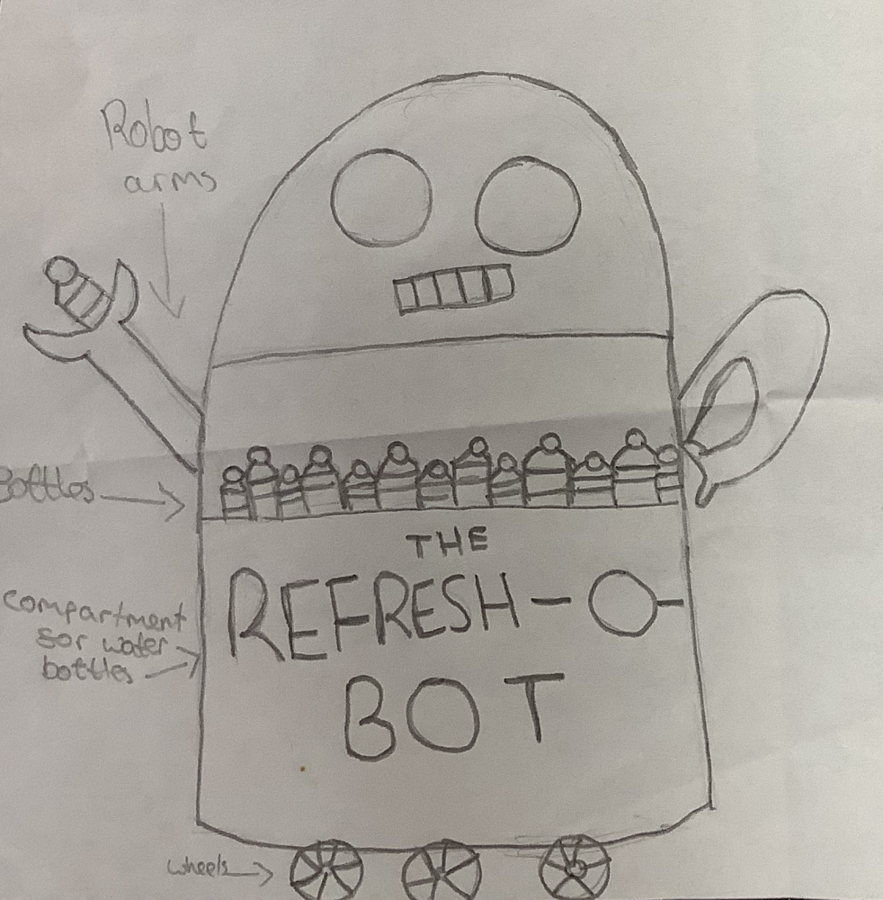 Keeping hydrated whilst travelling is very important Nenye and you have addressed this with your Refresh-O-Bot. How amazing that the water would be free, making it accessible for everyone. This would be especially good for people who have forgotten to pack a water bottle. The recycling bins are a very thoughtful addition. What will you invent next?