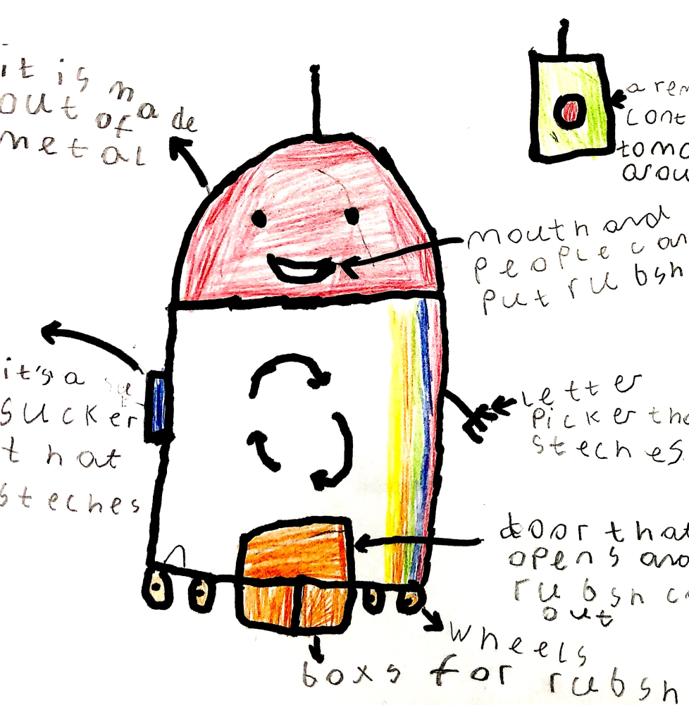 Enolia and the Robot Helper Bin work together to clean up litter from her local park!