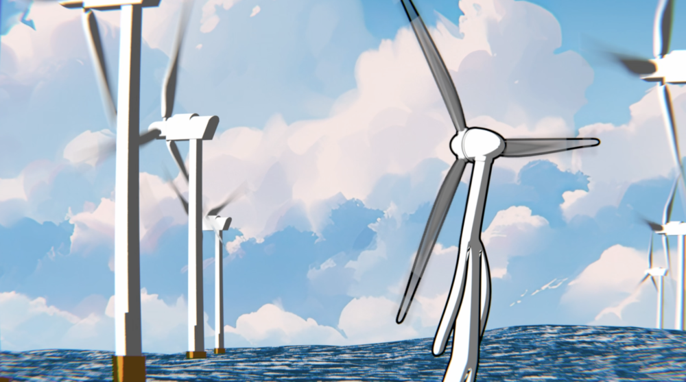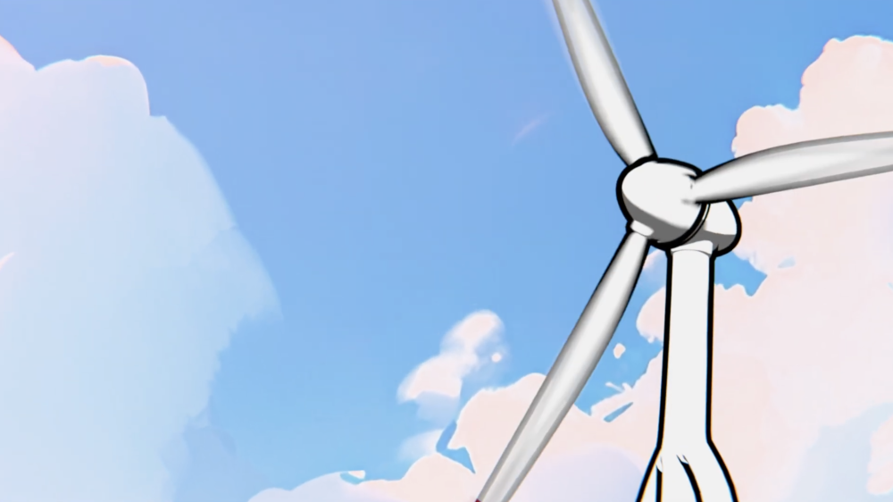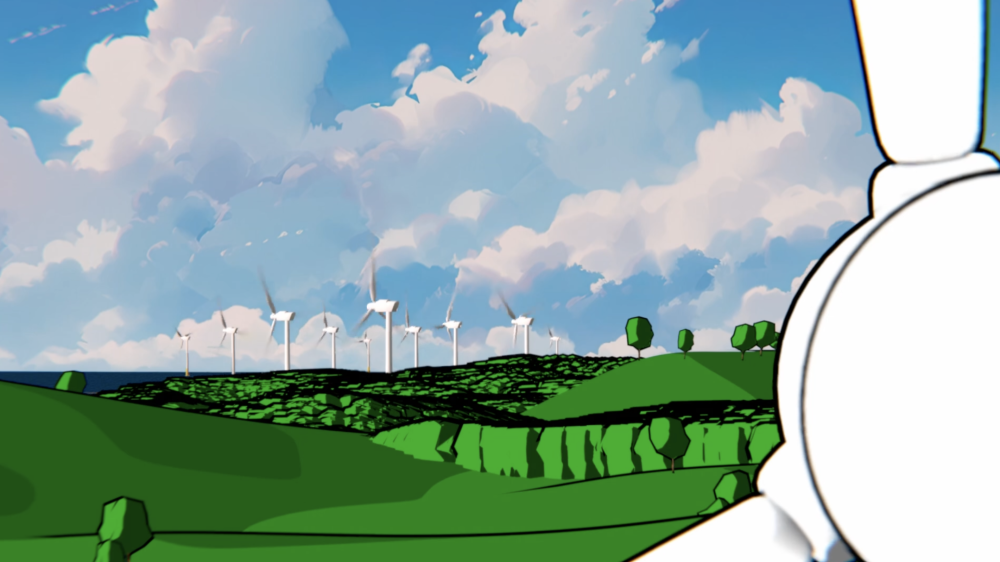 Scene 5: Arrival at the Wind Farm • The turbine reaches the wind farm, where other turbines greet her. • She takes her place and starts collecting energy again. • Voiceover: “Among friends and with steady wind, life is good.”