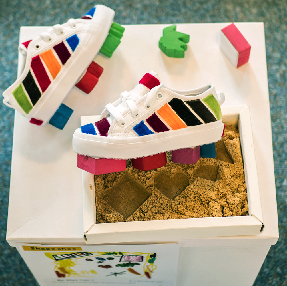 'I thought it was a very clever idea to wear different shapes on your shoes and to make interesting shapes in the sand while you walk and run. It was fun to make, I tried to copy the shapes in the drawing and use the same colours. I cut the shapes out of wood and used velcro on the bottom of the shoes and the pieces to make them stick together, which means you are able to change your design whenever you want to. A really great idea by Alex!'