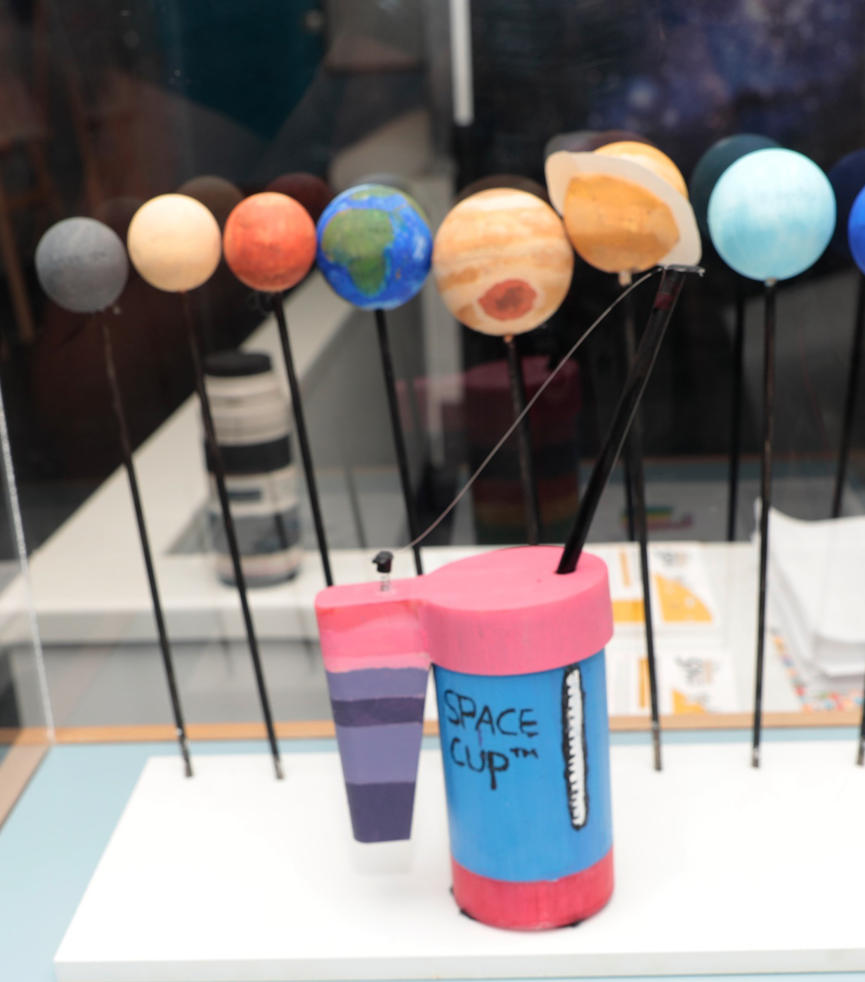 Everything is now actualized and we have all the pieces in hand. Assembly went quite smoothly in every fashion,but we had to make a few changes to make sure all was well. Aya and Vidhisha worked hard to meet the deadlines, working day and night to actualize the dream and make our little inventors dream come true with the planets to complete the scenery. Applying some of the rudimentary laws of physics, the team created a handy mechanism to properly have the straw open and close after minutes of pondering with a friend of the Space Concordia team, Muneeb. Finally, the night before shipment, Celeste re-ran over the cup’s design and cleaned up the paint with a steady hand and we finally put our little creation to rest in a box to Ottawa.