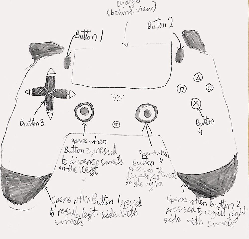 The Sweet Console is such a clever idea Harry, combining fun and practicality in a unique way. I love how you've designed it to look like a regular Playstation controller, which makes it not only a cool gadget but also a discreet way to enjoy sweets. The way you've utilised the buttons to access the sweets compartment is really smart, and the idea of using rechargeable batteries shows great attention to detail and sustainability. Well done!