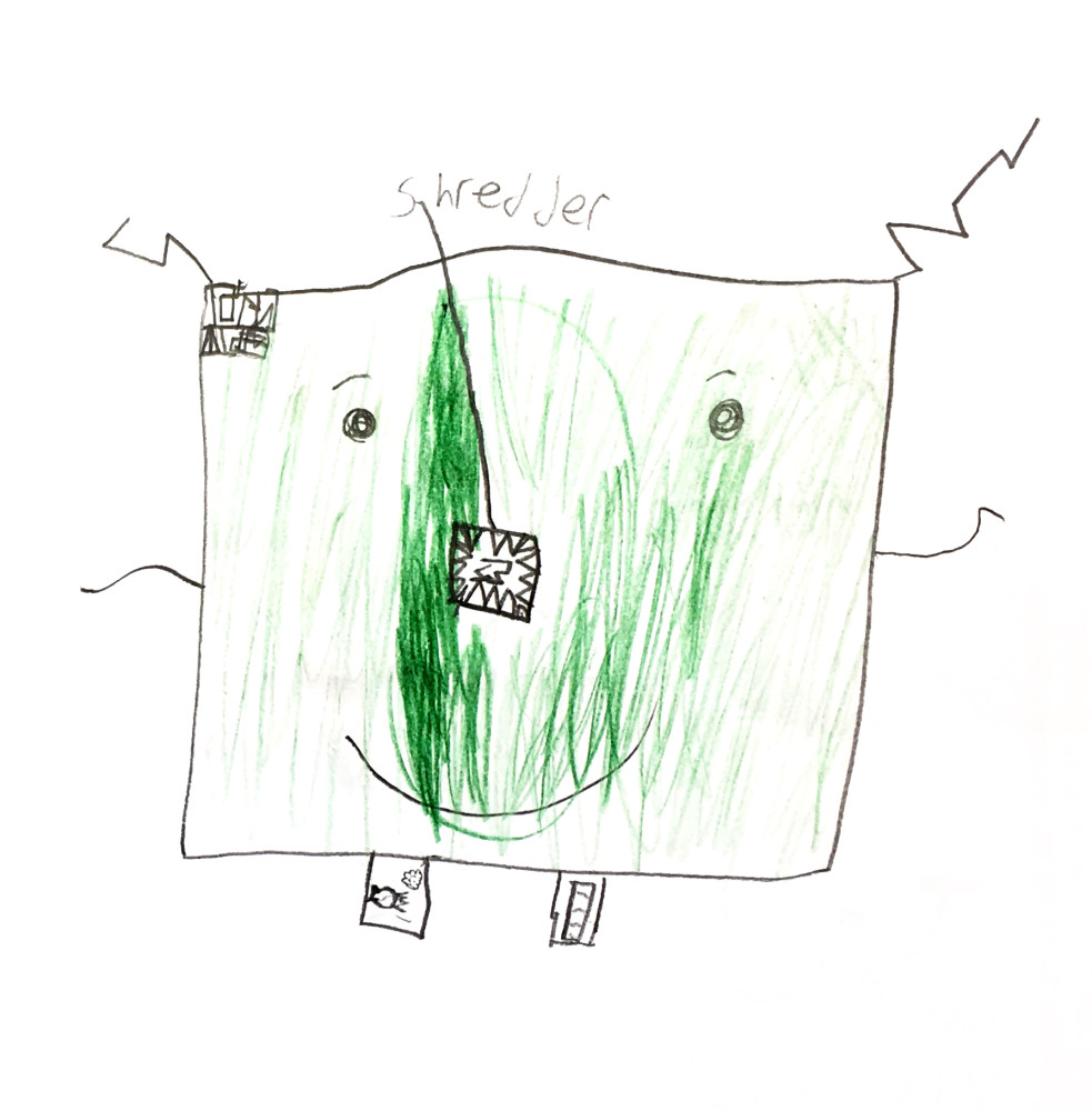 Thomas’ design for the Worry Shredder struck me because he managed to convey a really clever idea with a simple drawing. I could see the shredder helping in three ways. Firstly the act of writing down your worries can be helpful and I thought that shredding it after would feel good. Secondly I thought it would be quite magical when shredder prints out solutions, thirdly everyone feels better after a chocolate!