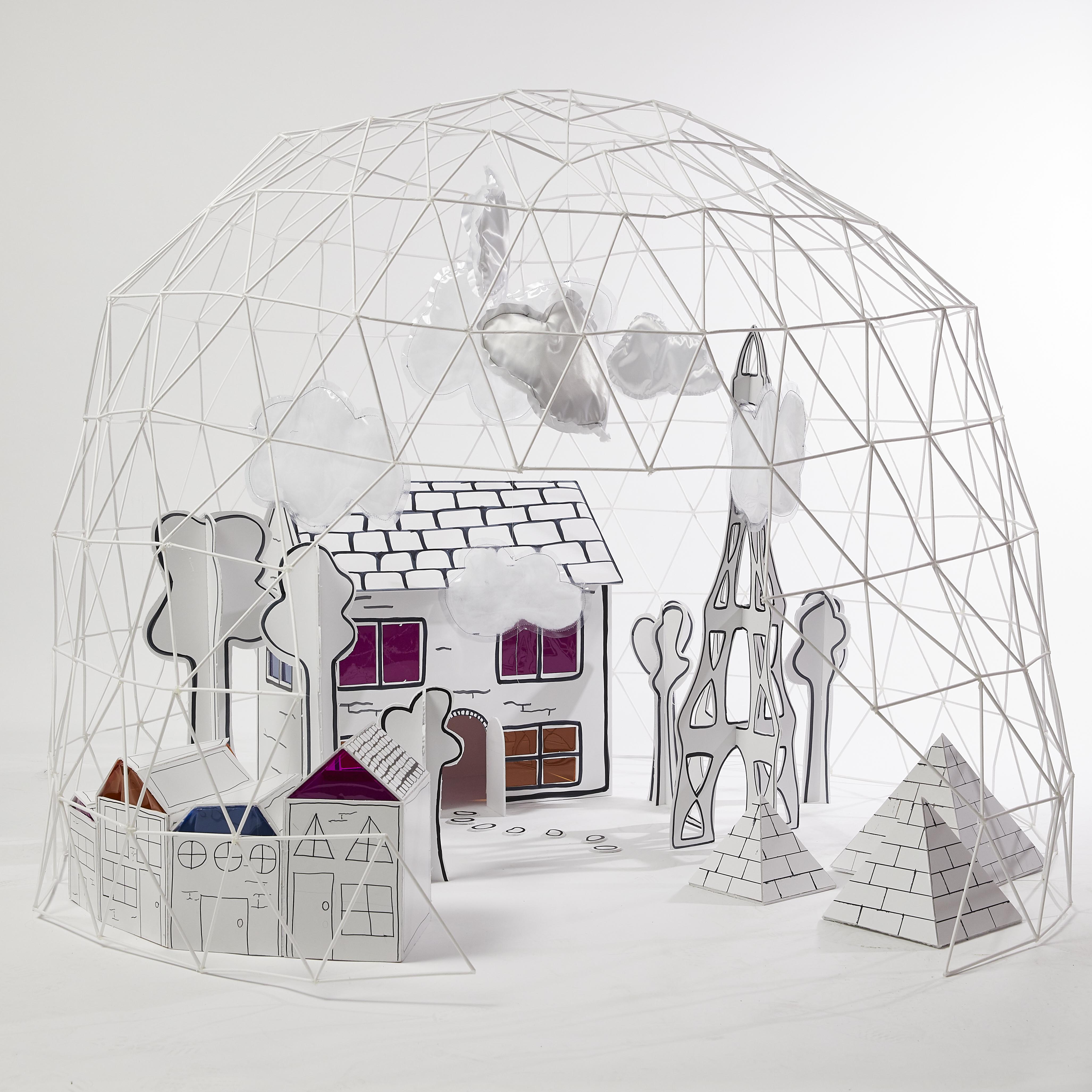 We created quick models of houses and trees from cardboard and glue to get a sense of how we were going to fill our space inside the dome. We were pleased with the miniature models but felt there was still some development to do to ensure they reflected Timothy’s creative drawing.