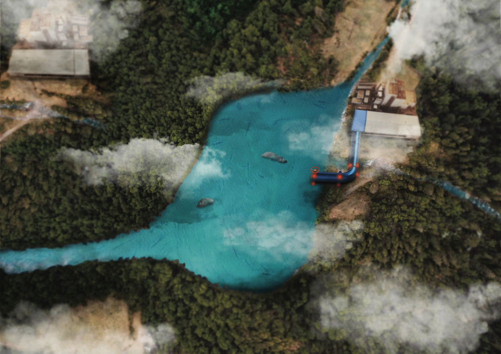 Fishes, octopus, and hippos are swimming in the ocean, while the pipe senses the chemicals in the water discharged by the industrial plant, so the pipe's gate is closed to protect the habitat.