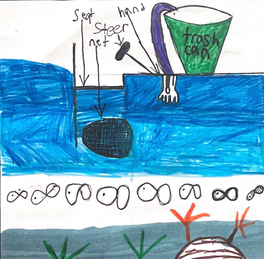 Fedde and Frank, this idea is really great. You have really thought about a big problem that affects the oceans and come up with a great idea to help solve it! It is very clever that it can recognise when the net is full and move the rubbish to the trashcan and your drawing shows this really well. I also love how colourful and detailed you've made your drawing guys, really well done!