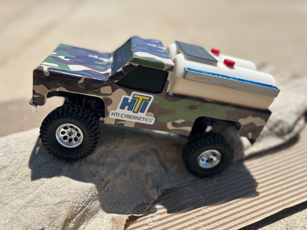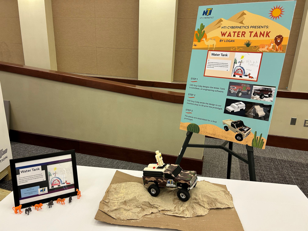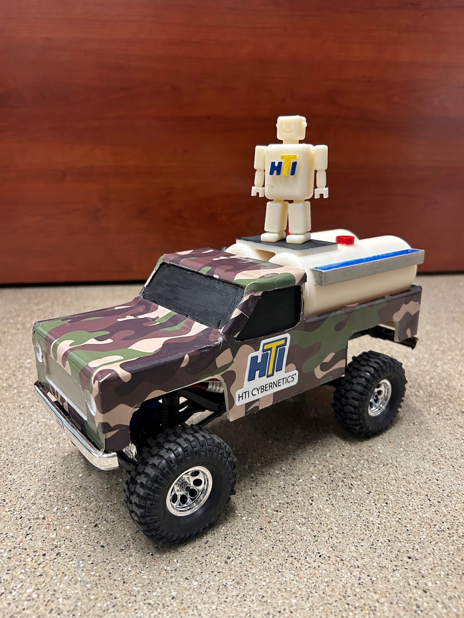 HTI was able to host Logan and his entire class at our facility to show them real robots in action! We were also able to give an in-person update on the Water Tank. CAD Guy Cody showed the class the latest model that now includes a rooftop solar panel, camo paint job, and working envelope for the trough and water spout concept.