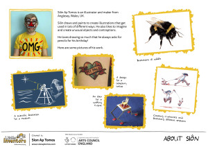 Siôn Ap Tomos is an illustrator and maker from Anglesey, Wales, UK, he creates illustrations that get used in lots of different ways and also likes to invent unusual objects and contraptions. He loves drawing so much that he always asks for pencils for his birthday!