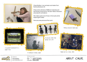 Chloe is an animator and model-maker based in Northumberland, using both digital animation and more traditional methods like stop motion. Chloe also shares her skills with others as an Associate Lecturer at Northumbria University.