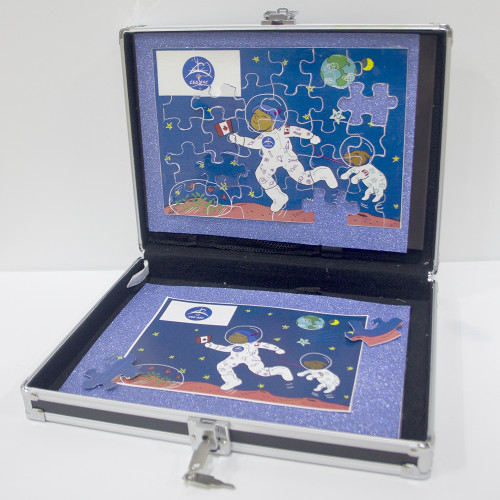 The magneton has come to life! I made two illustrations that I proposed to the inventors for them to choose. We made a Skype video-call and we discussed of making a new illustration modifying what they liked the most from both: instead of a Mars landscape with no characters or a Moon landscape with a girl astronaut, they suggested a Mars landscape with the girl astronaut and her pet dog astronaut. I printed the jig-puzzle pieces on card stock instead of magnetic paper because the magnets were not strong enough to hold on to the game board. I glued the pieces with hot glue and left it uncompleted as if it was "in progress". It was really fun to make!